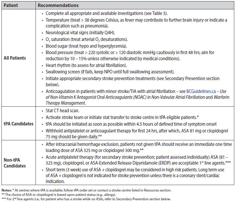 Table 5: Management recommendations for all stroke/TIA, including tPA and non-tPA candidates